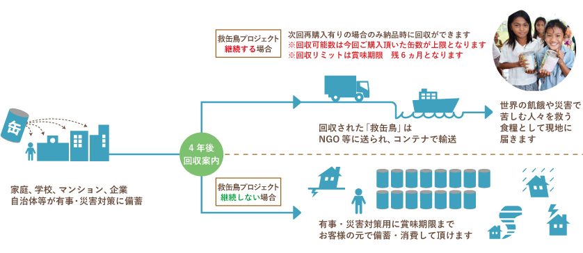 備蓄いただいたパンの缶詰を賞味期限前に回収し義援物資としてNGOなどを通じて飢餓地域や被災地に送られます。